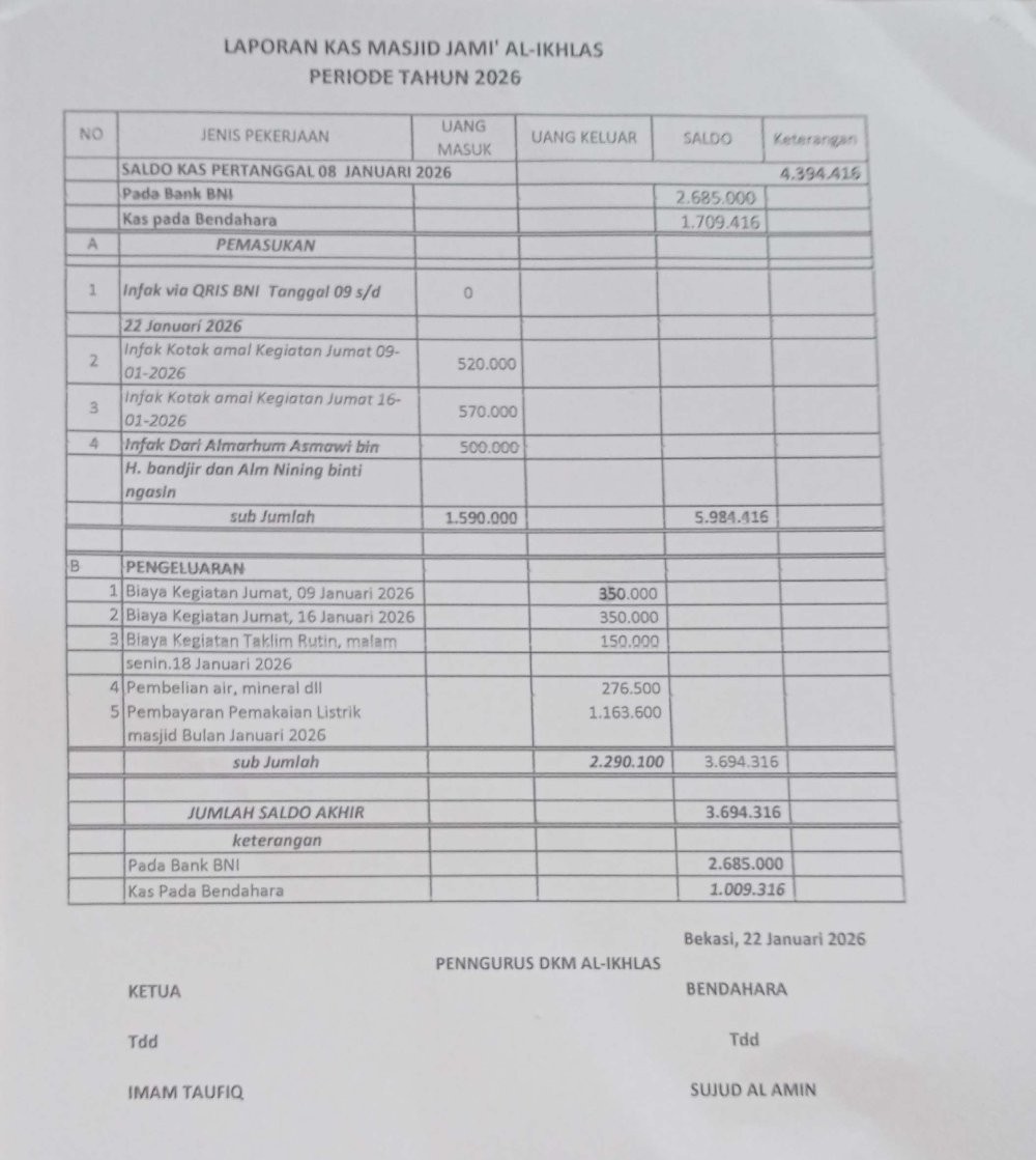 Laporan Keuangan Masjid Jami Al-Ikhlas periode per tanggal 22 Januari 2026